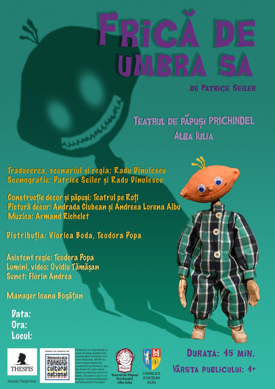 „Proiectul Frică de umbra sa își propune continuarea introducerii tehnicilor digitale în spectacolul viu, pornind de la albumele de benzi desenate ale lui Patrice Seiler. Pentru acest spectacol, preponderent vizual, s-a realizat un scenariu teatral, un univers scenografic, cinematografic, s-au construit decoruri reale, obiecte și păpuși, din obiecte de recuperat, pornind de la colajele de fotografie originale ale albumului Peur de son ombre. Spectacolul militează pentru înfrângerea sentimentului fricii legate de necunoscut, de întuneric, de umbre, de monștrii pe care-i zămislește subconștientul, noaptea, în preajma somnului. Personajul nostru, Nostoc, este un copil de cinci ani, care se luptă cu umbrele obiectelor din jurul patului său, din bucătărie, din baie, sau din debara!” – Radu Dinulescu, regizor
