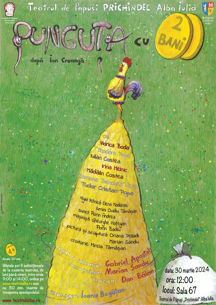 “Punguța cu 2 bani” este pentru mine întâlnirea fericită dintre o poveste clasică renumită și o trupă de actori foarte talentați. Am încercat să păstrez proaspete expresiile marelui Ion Creangă și specificul popular al poveștii, ajutat fiind de refrenele pe ritmuri tradiționale românești alcătuite special pentru acest spectacol. Am scos în evidență caracterul năzdrăvan al cocoșului, bunătatea moșului și răutatea babei, dar nu am uitat de povestea de dragoste dintre găină și cocoș. Latura educativă a spectacolului se bazează pe înfruntarea dintre bine și rău. Va reuși oare cocoșul să-și recupereze punguța cu doi bani în povestea de la Teatrul PRICHINDEL?