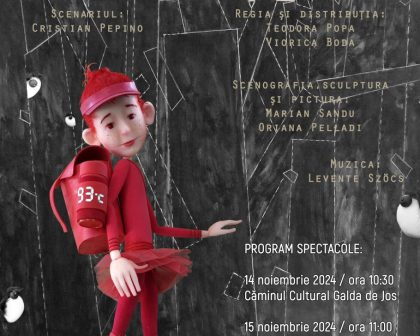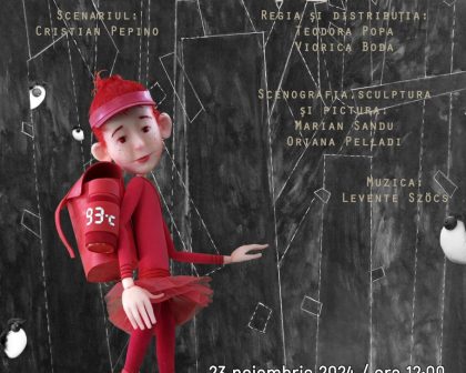 Find out more23 noiembrie 2024 / ora 12:00 / Sala 67 – Teatrul de Păpuși Prichindel Alba Iulia SCUFIȚA ROȘIE Scenariul: Cristian Pepino Regia și distribuția: Teodora Popa și Viorica Boda Spectacol de teatru pentru copii (45 min. / 4+) Despre spectacol: Cine nu știe povestea fetiței care pornește la drum spre bunicuță și, neascultând de povețele mamei, ajunge, împreună cu bunica, în burta lupului! Ei bine, povestea noastră este puțin altfel. Prin talentul și umorul lui Cristian Pepino, care a scris…